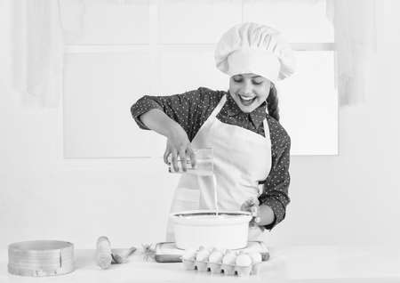 looking good. teen girl preparing dough. making cake by recipe. time to eat. happy child cooking in kitchen. bake cookies in kitchen. professional and skilled baker. kid in chef uniform and hat
