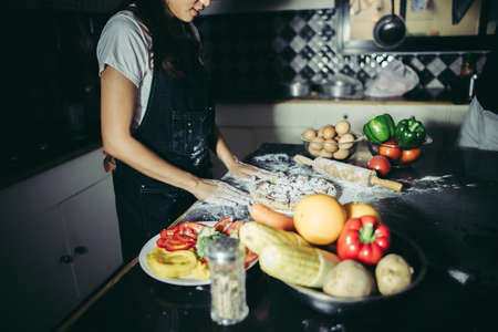Woman cooking homemade pizza at home. Cooking concept.