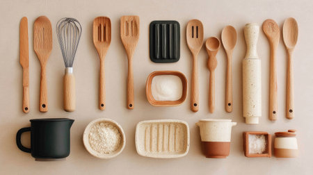 A beautiful arrangement of wooden and ceramic kitchen utensils on a neutral background, perfect for inspiring creativity in cooking and home baking activities.