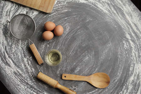 Chicken egg, flour, olive oil, kitchen tool on gray table background. Products for baking bakery products. Cutting board, rolling pin, flour sieve, wooden spoon. For bread or cake