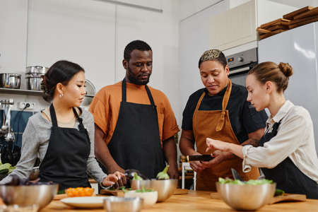 Waist up portrait of diverse group of people listening to chef in cooking class
