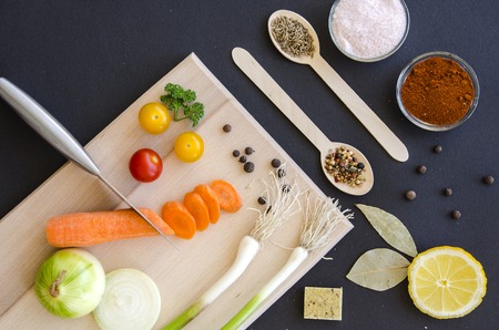 Fresh delicious ingredients and spices on a wooden spoon for healthy cooking on dark black background and wooden cutting board, top view, banner. Diet or vegetarian food concept.