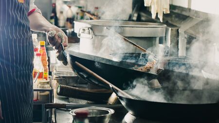 Chef stir fry in wok. Dramatic cooking with fire hard in kitchen