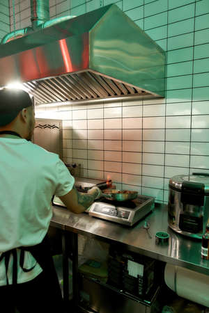 chef in the open kitchen, working at cooking station in the restaurant and cafe