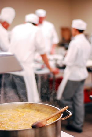 Large pot cooking in focused foreground with chefs in background out of focus