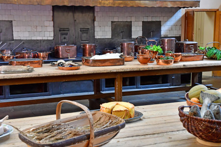 Vintage culinary artifacts and antique cookware are showcased in a historical kitchen exhibition from bygone eras