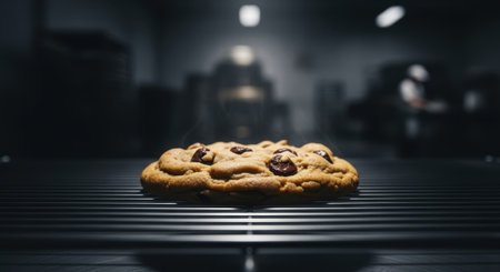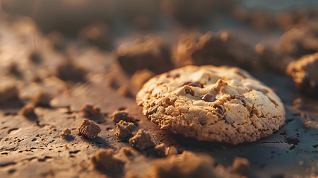 AI Generated. Close-up of a chocolate chip cookie lit by sunlight