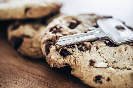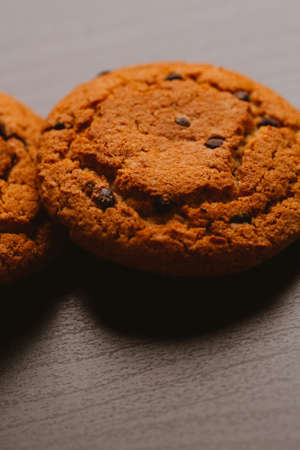 Chocolate chips cookies, close up, macro selective focus