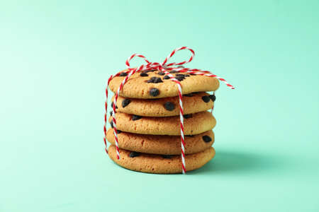 Pile of chocolate chip cookies on mint background