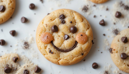 Freshly baked smiling cookies feature chocolate chips and colorful toppings, ready for enjoyment at any gathering.