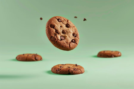 Delicious chocolate chip cookies floating against a vibrant turquoise background