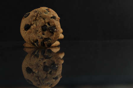 ood background cookies round with chocolate drops lying standing on the edge of the edge with a reflection on a black dark mirror background side view of copy space