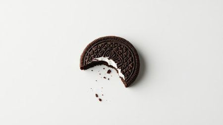 A single Oreo cookie with a bite taken out of it, isolated on a white background, showing the perfect blend of cream and crunch.