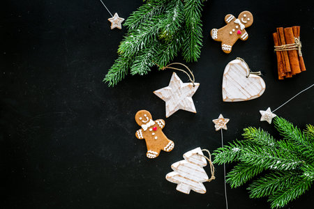 Christmas decorations and gingerbreads on a dark concrete table. Preparing and decorating the house for holidays