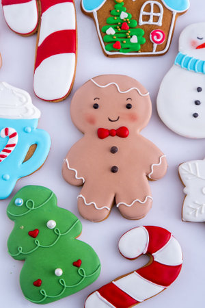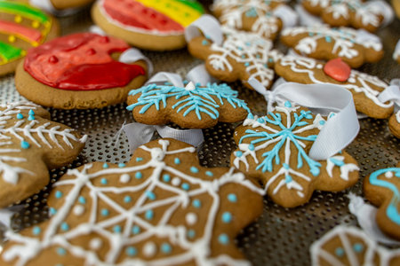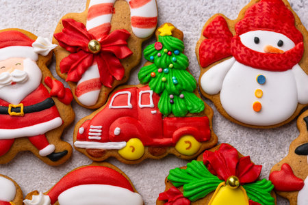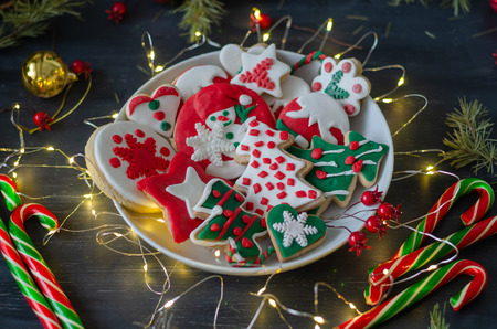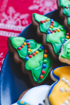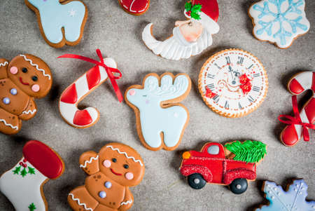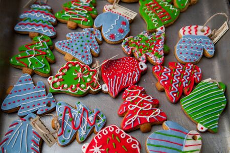 Gingerbread cookies with multicolored frosting decorated for Christmas and New Year holidays