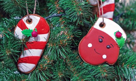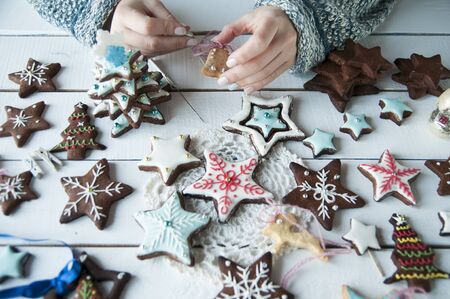 Christmas gingerbreads painted with sugar icing. Holiday cookies on cookies. Cookies in the shape of a snowflake, gift, candy, sock
