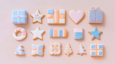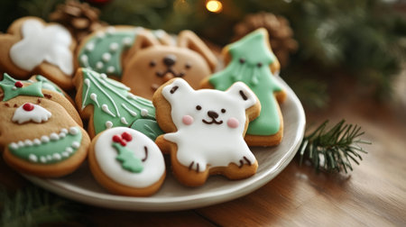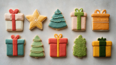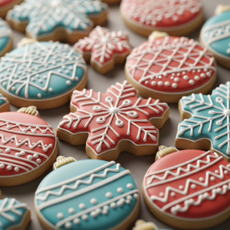 Close-up of delicious Christmas cookies, decorated with festive ornaments and a Christmas tree in the background. A delightful holiday scene.