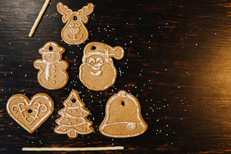 Homemade Christmas gingerbread cookies made as sweets and holiday table decorations