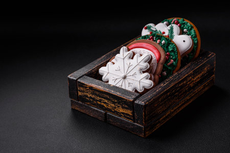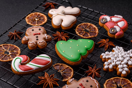 Fresh delicious baked christmas or new year gingerbread cookies with bright color themed pattern on dark concrete background