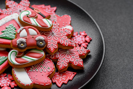 Delicious fresh colorful Christmas or New Year gingerbread cookies on a ceramic plate on a dark concrete background