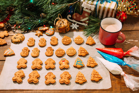 Festive background of Christmas bakery. Culinary art with icing homemade gingerbread cookies. Family celebration, holiday decoration and New Year traditions concept