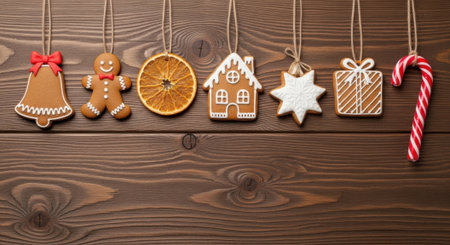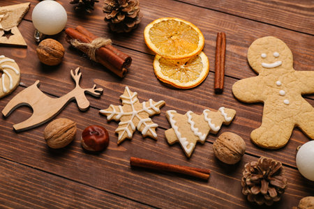 Christmas gingerbread cookies with Christmas decorations on wooden background. Traditional Christmas baking.