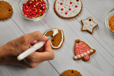 Decorating traditional gingerbread cookies with royal icing for Christmas.