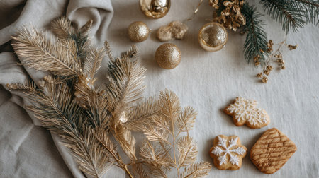 Festive background with Christmas cookies and glitters, golden surface