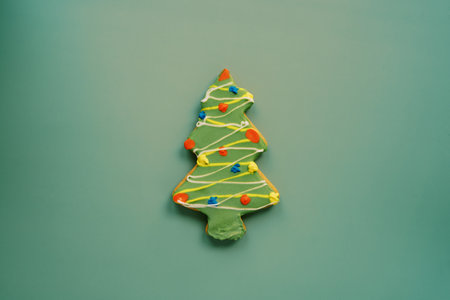 Green glazed Christmas tree cookie on a dark green background