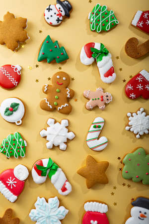 Christmas background wit selection of homemade colorful gingerbread cookies. Top view, copy space