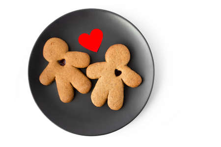 A pair of gingerbread lovers with hearts on black plate isolated on a white background.