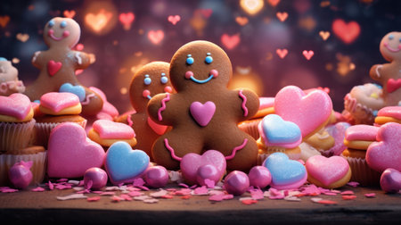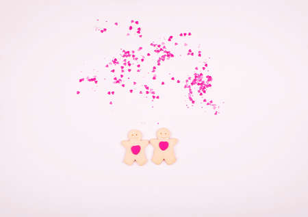 Shortbread cookies in the form of a man with a heart, a small decor of hearts, candy. A gentle background and a place for writing.