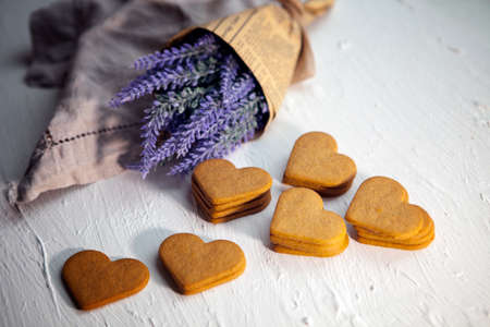 Gingerbread Hearts Cookies with lavender flowers on a white wooden table. Delicious Homemade Hearts Cookies on a white background. cookies in the shape of hearts for Valentine day. Love sweeties.