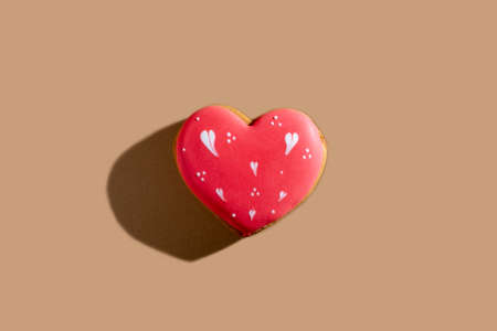 Happy valentines day. Love pastry. Festive decorated bakery. Homemade red white icing gingerbread heart cookie isolated on beige pastel.