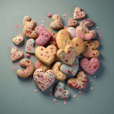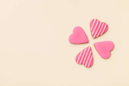 Heart shaped cookies for valentine's day on rustic wooden background. Top view with copy space.