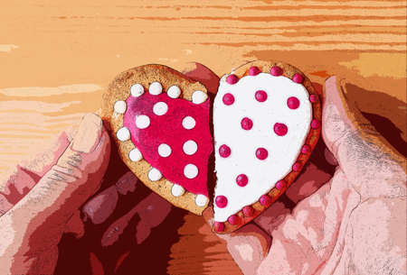 Couple's hand holding two half heart shaped cookies attach on wooden background