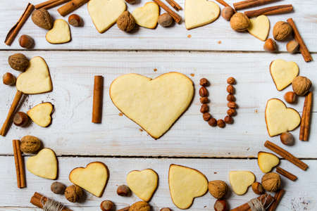 Love Lettering with Cookies on White Background. Top View Baked Letters Design Template.