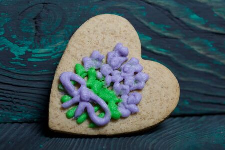 Gingerbread decorated with glaze. Made in the shape of a heart. On brushed pine boards.