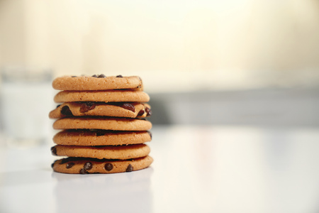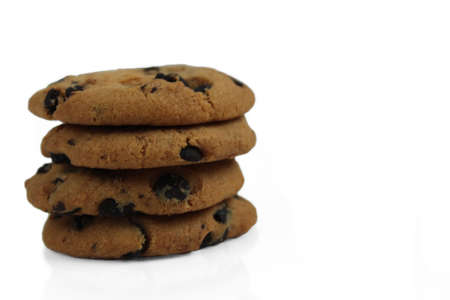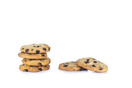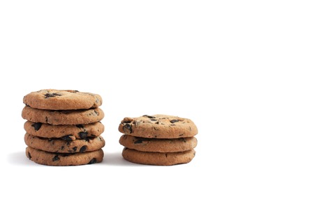 delicious cookies with chocolate piled into two stacks of five and three on a white background