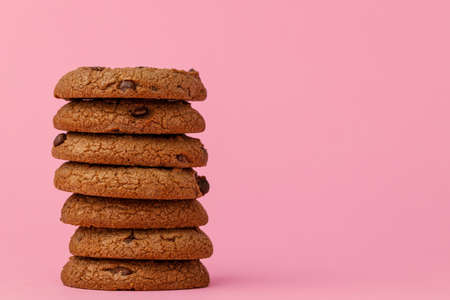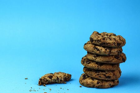 Stack of homemade chocolate chip cookies on a blue background. Close-up of sweet and delicious baked goods.