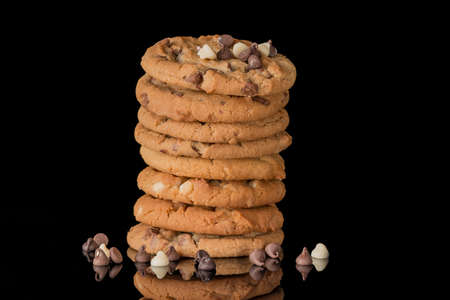 three four or five several cookies chocolate with chocolate are stacked tower on top of each other on a white light background with a reflection of the copy space side view