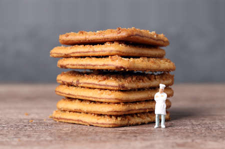 A pile of crispy cookies and a miniature chef. Miniature people and business concept.