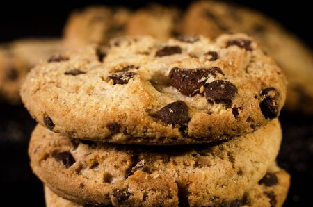 Stack of chocolate chip cookies on black background, shallow depth of field