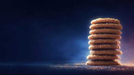 Delicious cookies arranged in a neat stack, showing their texture and warm color in low light