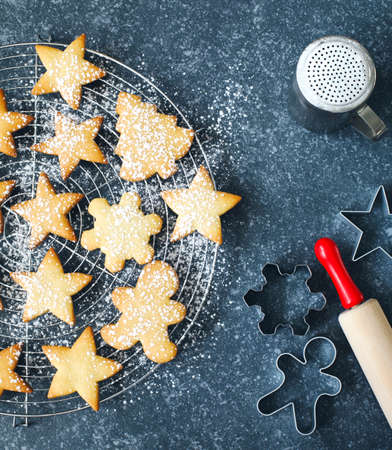 Christmas baking background. Christmas cookie cutters molds on the kitchen baking table. Festive food and New Years mood
