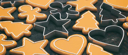 Christmas preparation, gingerbread cookies. Flat lay of gingerbread cookies and cutters, against black background, wallpaper. 3d illustration