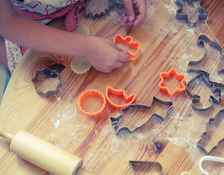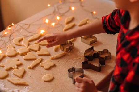 Hand of a little boy making traditional christmas cookies. Raw dough and cutter for holiday cookies. Cooking Christmas gingerbread cookies.
