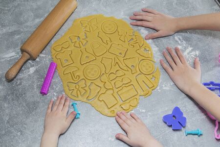 Selective focus. Kids making gingerbread cookies with various Christmas cookie cutters. Gingerbread dough. Family Christmas fun moments