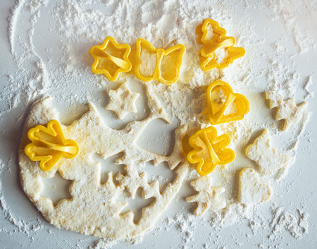 Raw dough and cutters for the holiday cookies on table. Preparing Christmas gingerbread cookies. Steps of making biscuits. Top view.