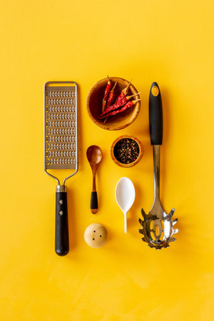Flat lay compoisition of kitchen tools on yellow background. Minimalism. Top view